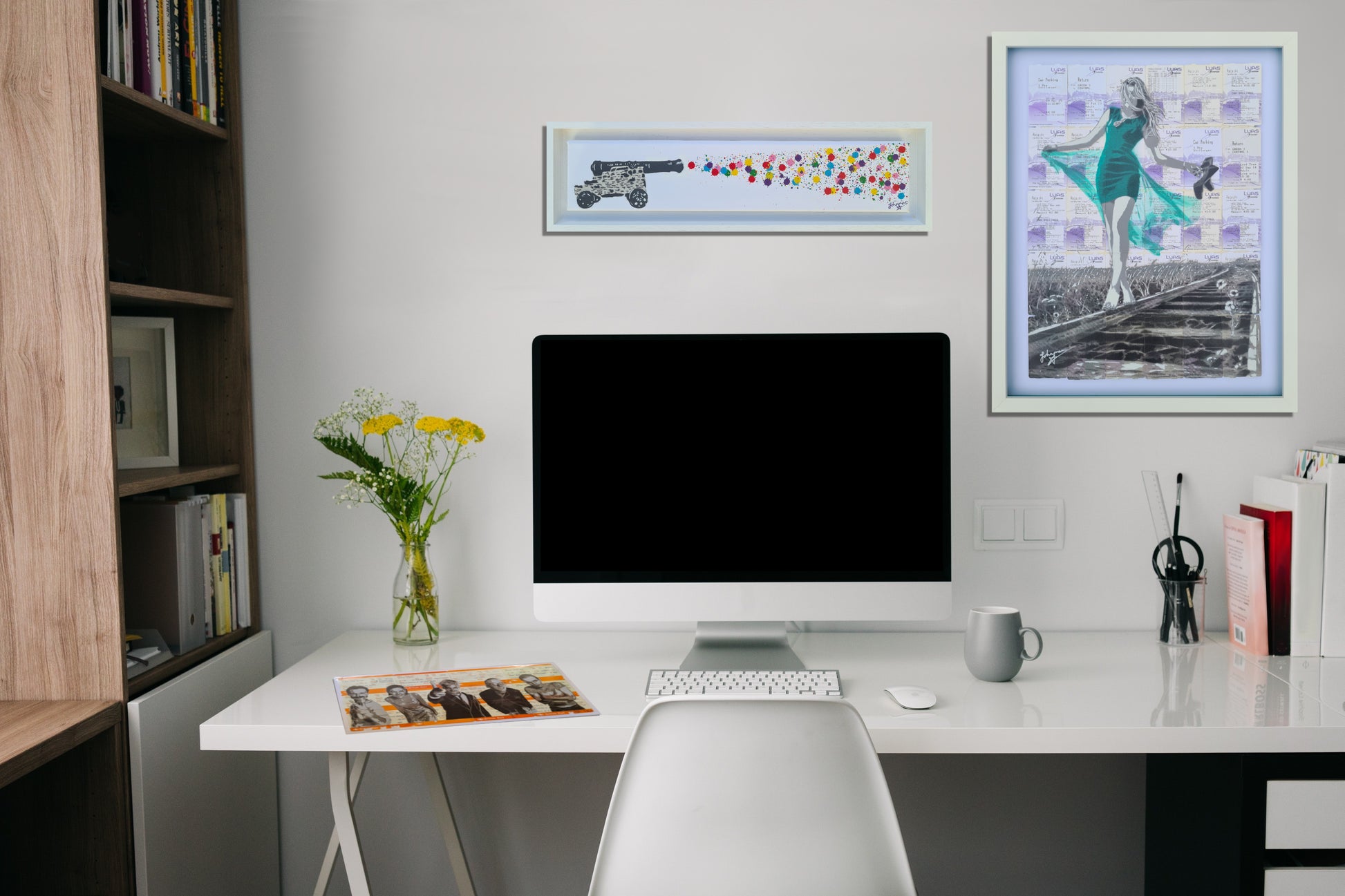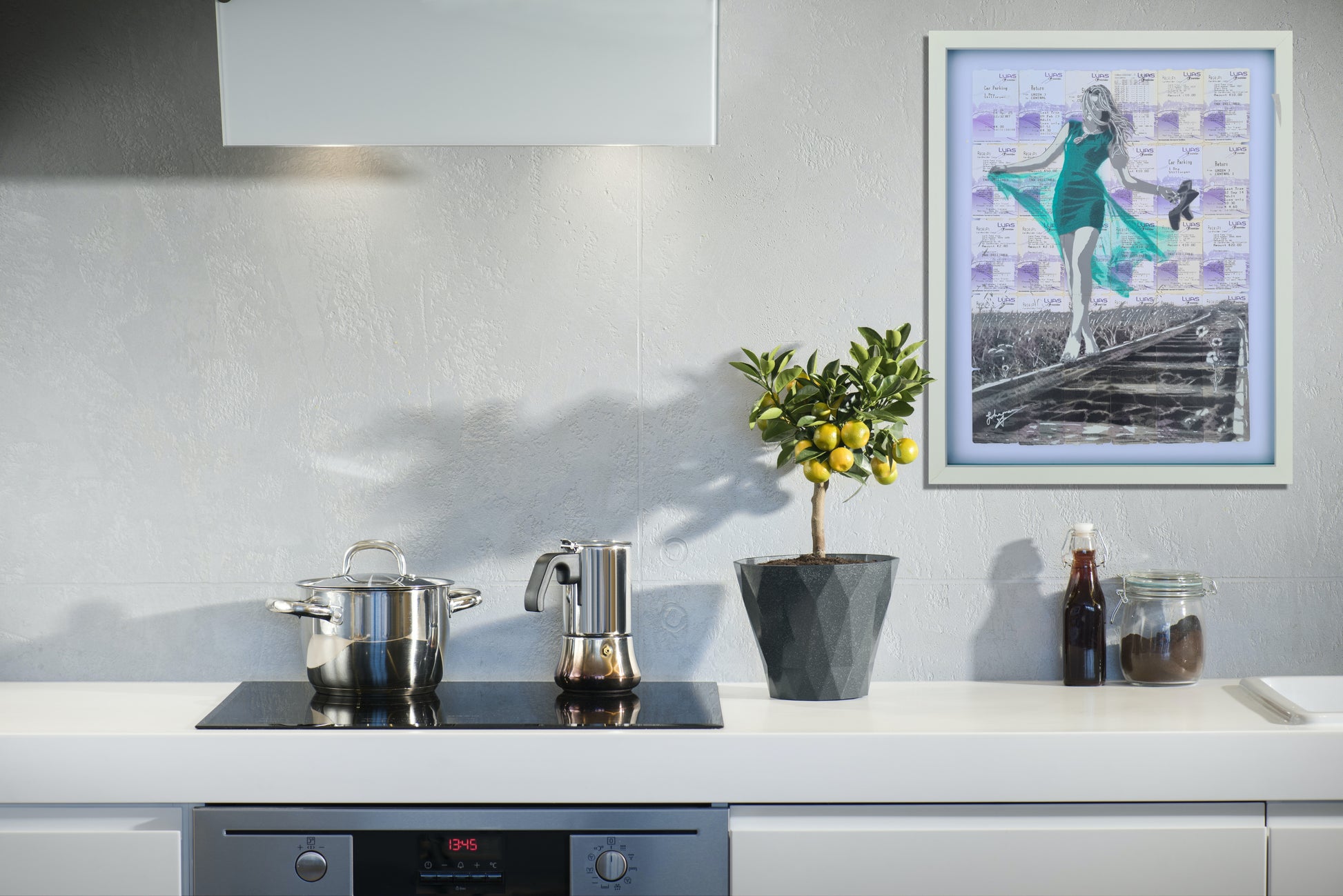 This is one of Johnman's renowned train ticket artworks depicting a young woman walking along a railway line, with her hair and teal dress blowing in the wind while she carries her black, high-heeled shoes in her hand.