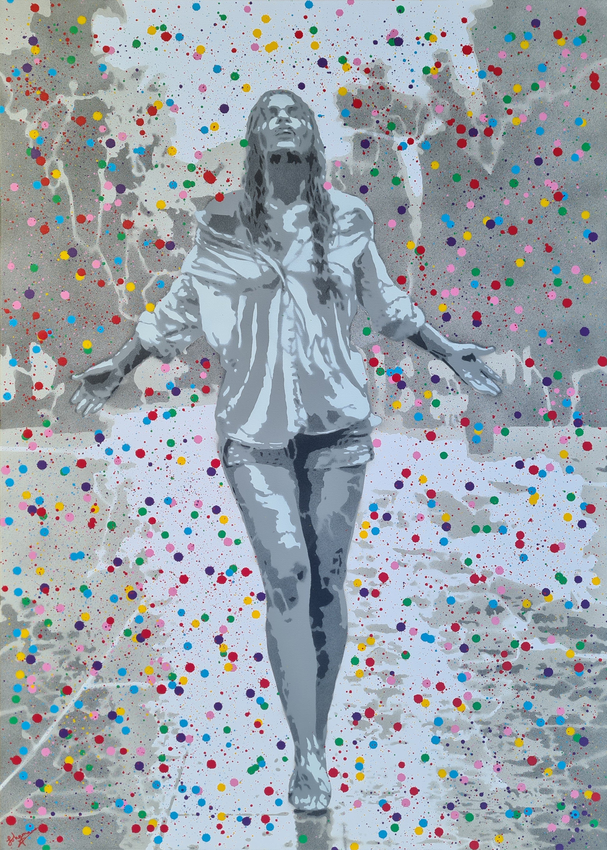 Painted entirely with spray paint, the main image has been created with the use of a hand-cut stencil with the splashes of colour then applied with a gently mis-fired spray can, causing the paint to splatter over the image.