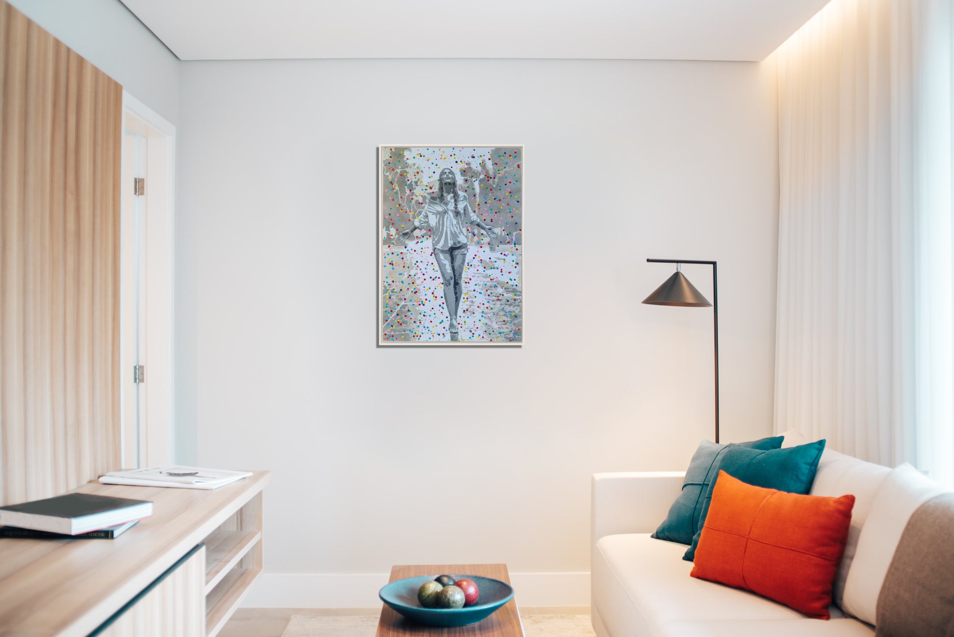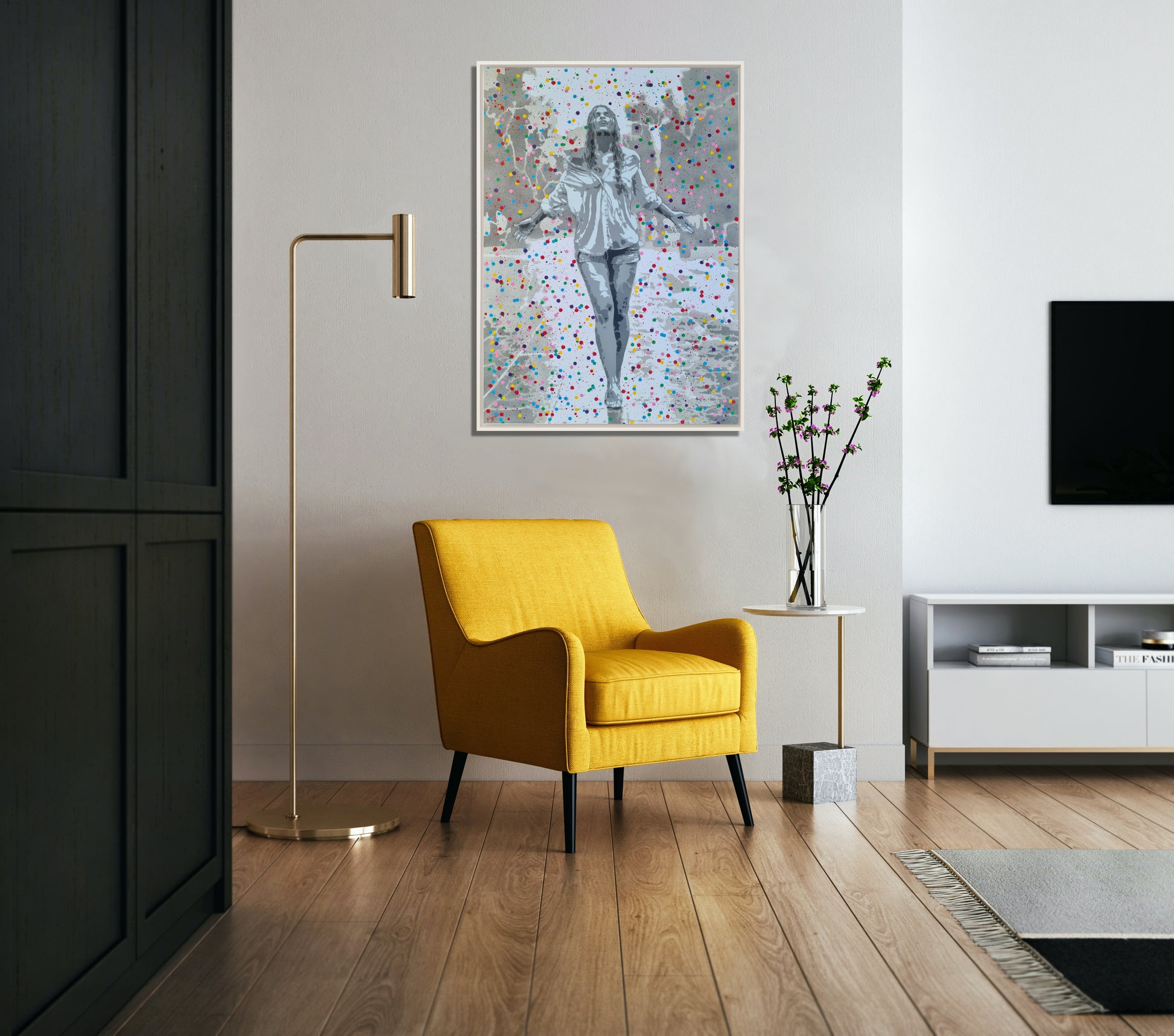 This painting entitled "Embrace the Rain" depicts a young woman enjoying a downpour of colourful rain drops.