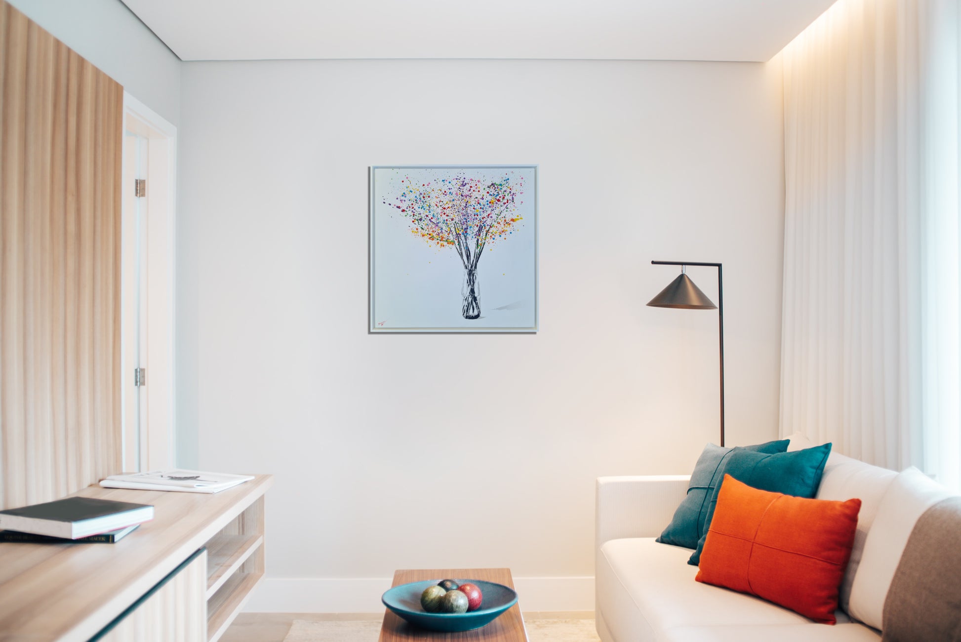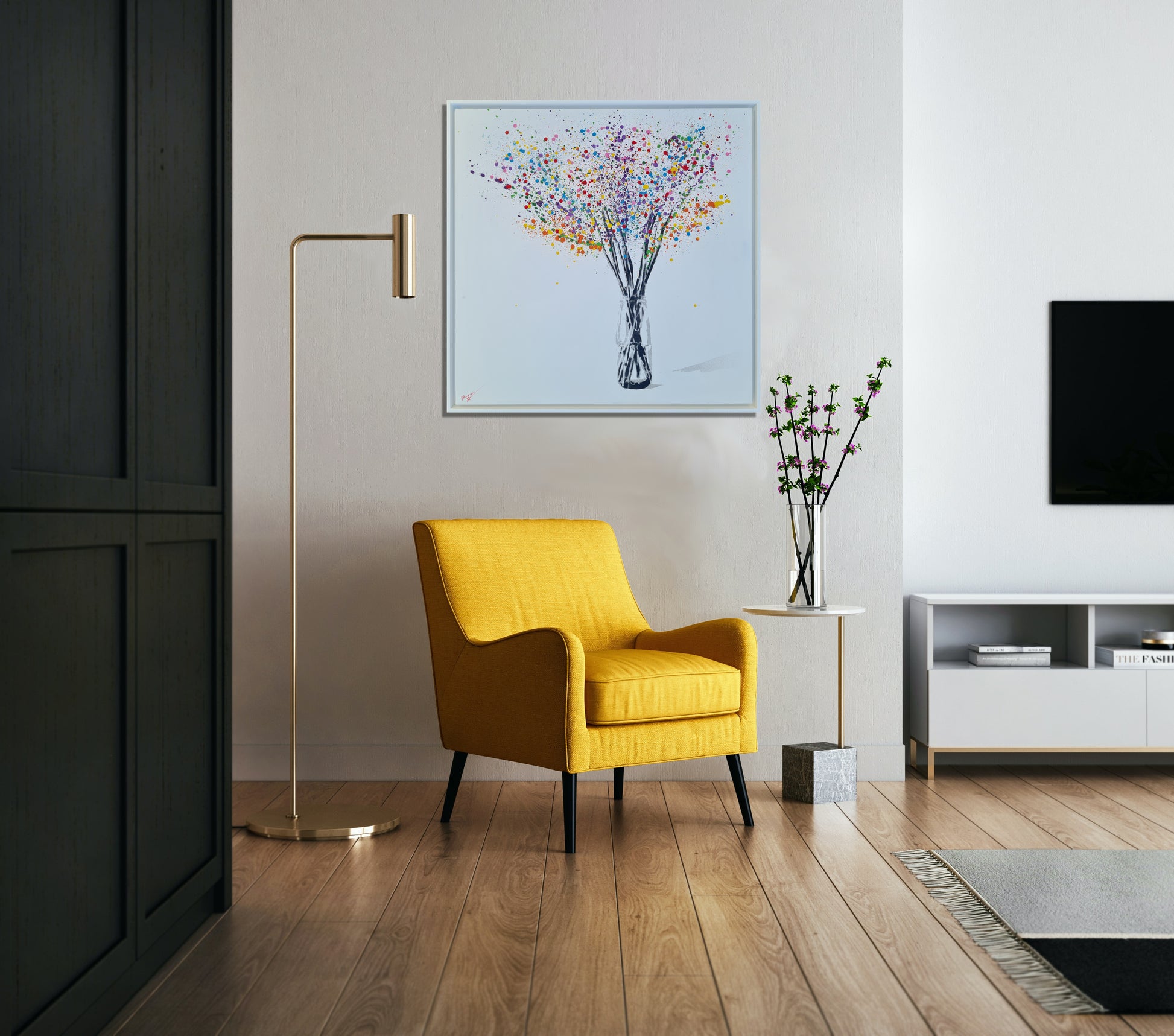 This vibrant artwork measures 80cm x 80cm and is presented ready-to-hang in a contemporary, white tray frame as pictured.
