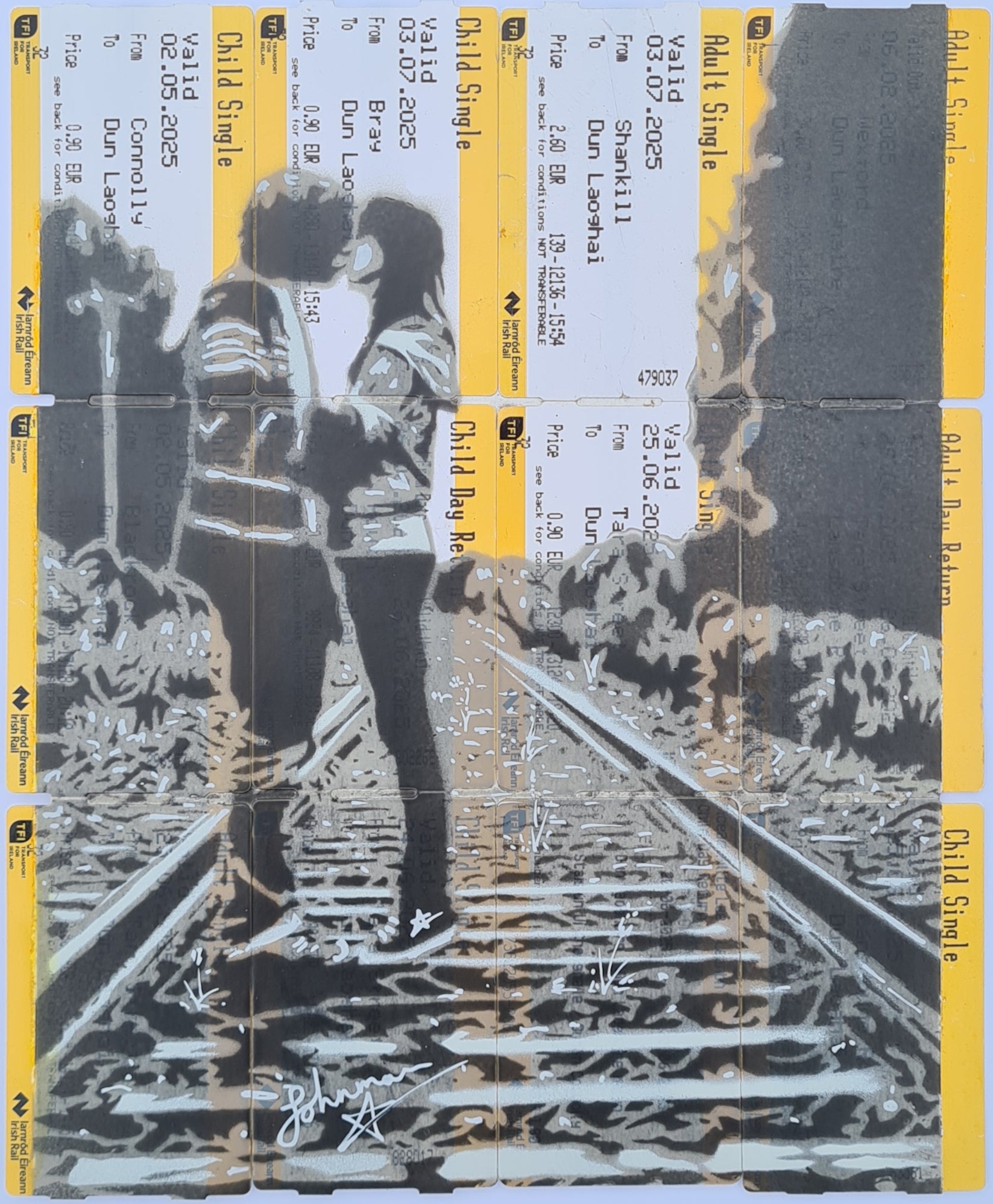 Spray paint on Irish Rail tickets, hand finished with acrylic ink.