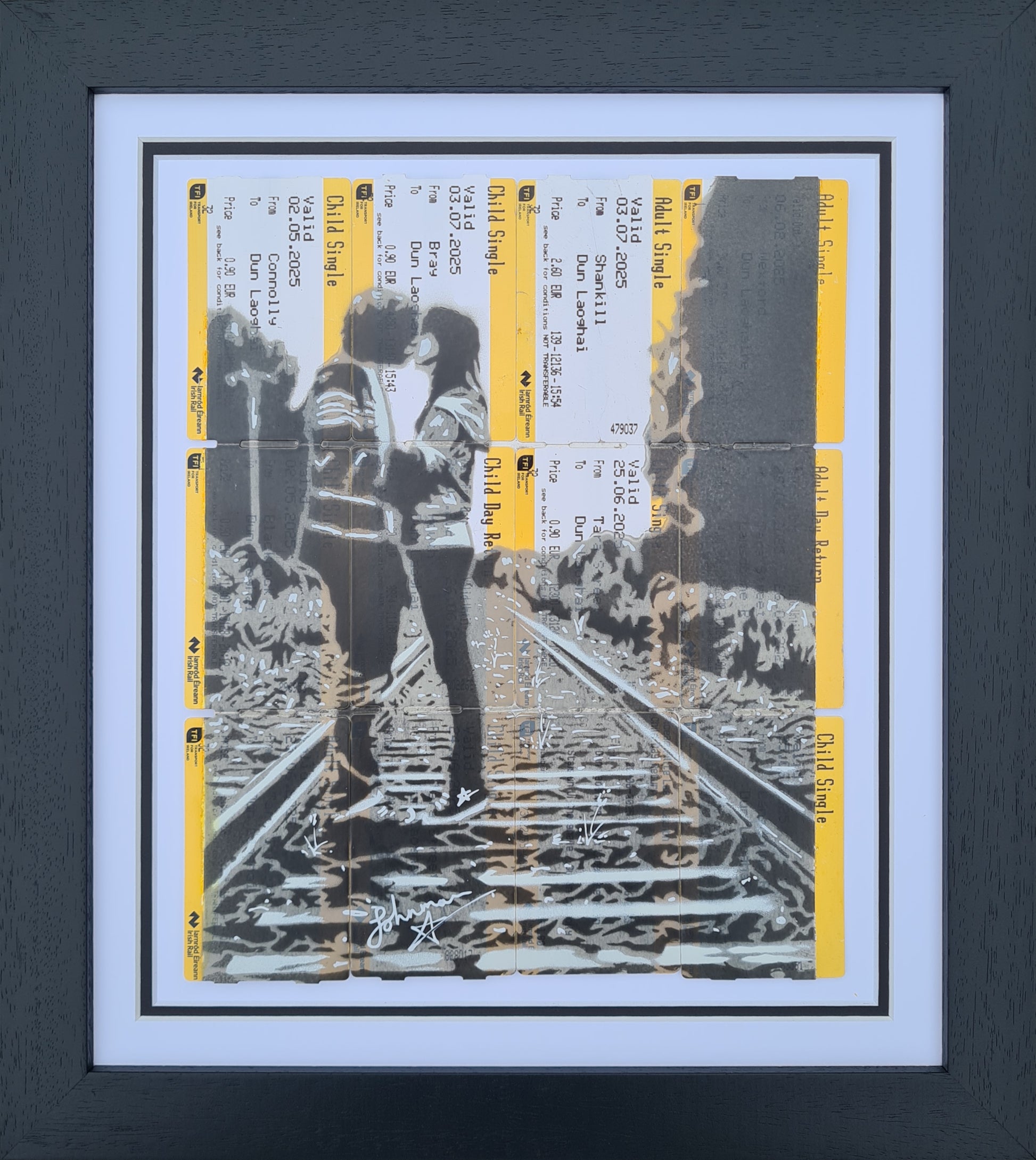 This is one of Johnman's renowned train ticket artworks depicting a young couple embracing on a railway line. The piece is entitled "Teenage Kicks" and symbolises the joyous experiences we share with our loved ones.
