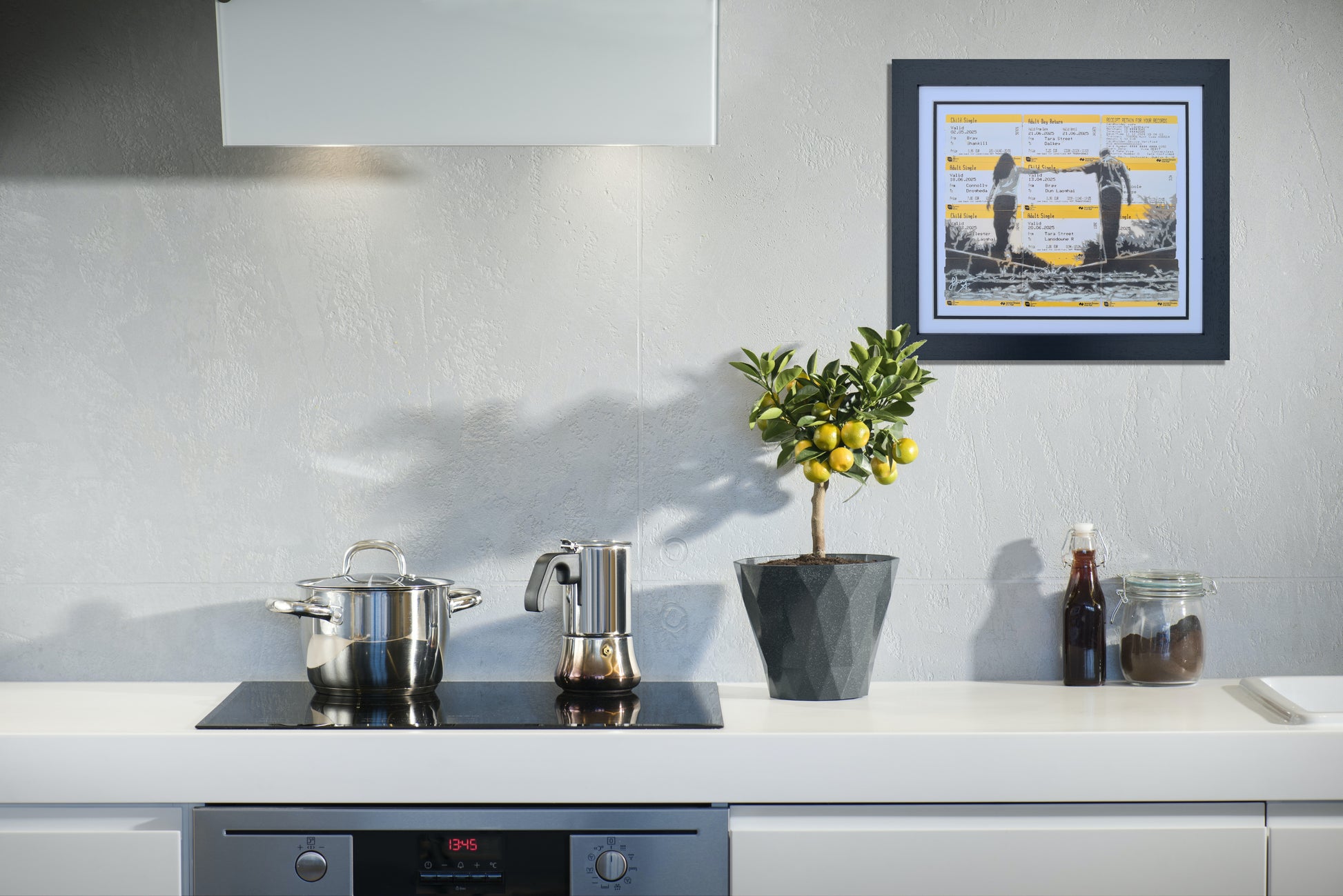 This is one of Johnman's renowned train ticket artworks depicting a couple walking hand-in-hand along a railway line. The piece is entitled "To the Horizon" and symbolises the joyous experiences we share with our loved ones, using the tracks as a metaphor for life's journey.