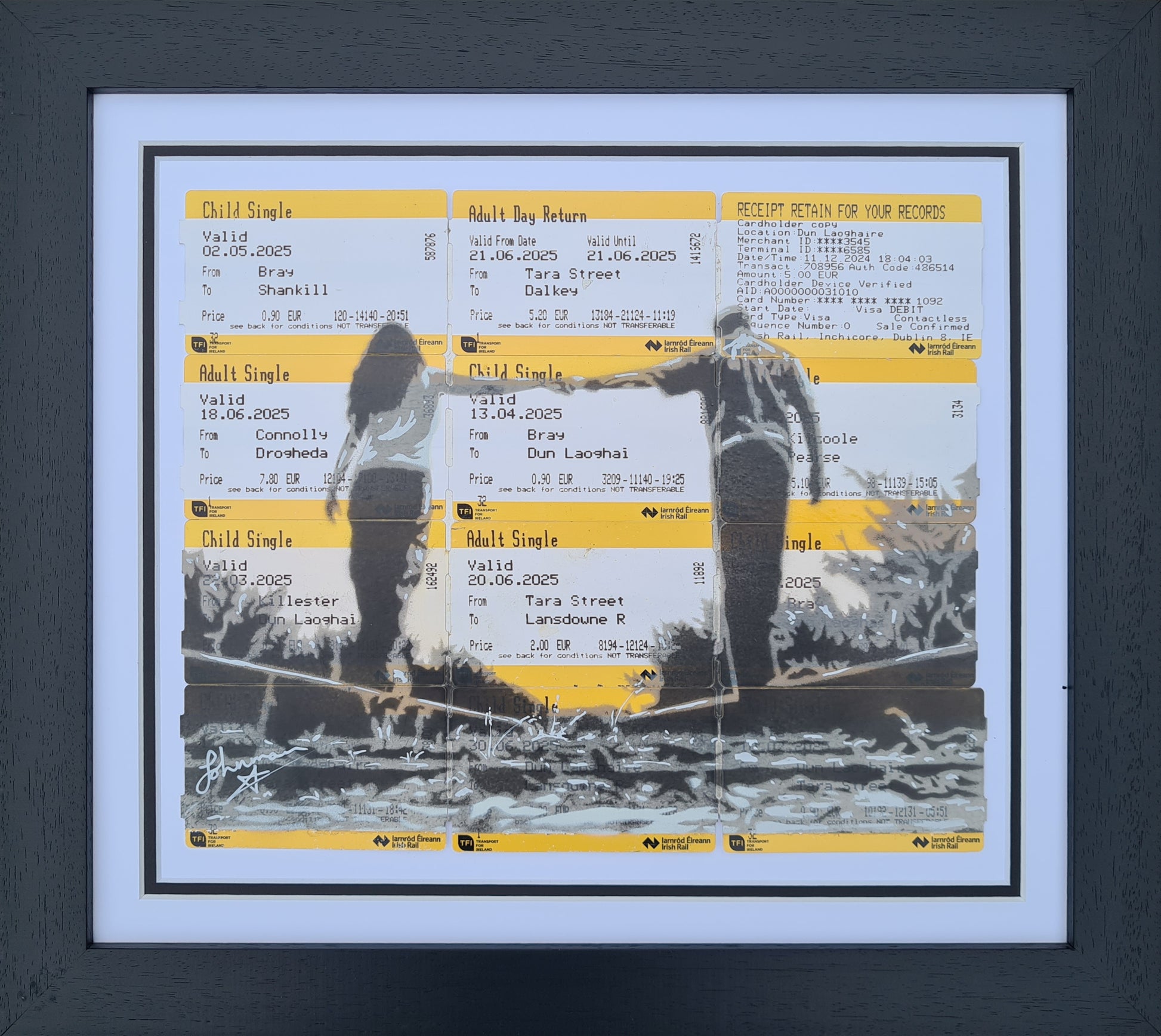 Spray paint on Irish Rail tickets, hand finished with acrylic ink.